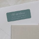 Elegant return address label features your name in white calligraphy script lettering with your address beneath in classic serif, on a muted turquoise aqua background. Designed to coordinate with our Coastal Oyster wedding and event collection.