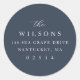 Round return address seal features your name and address in classic white lettering with a script accent, on a muted navy blue background. Designed to coordinate with our Coastal Oyster wedding and event collection.