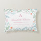 Un bel oreiller décoratif, parfait pour la crèche de votre petite fille ! Il présente des tourbillons, des feuilles et des fleurs en vert menthe, rose clair, orange et bleu ardoise clair, encadrant la coussin. Le texte est facile à customiser et la couleur peut être changée si vous le souhaitez. Le dos de la coussin est rose clair, mais la couleur peut être customisée si vous le souhaitez. Chic chic, coloré, élégant - parfait!
