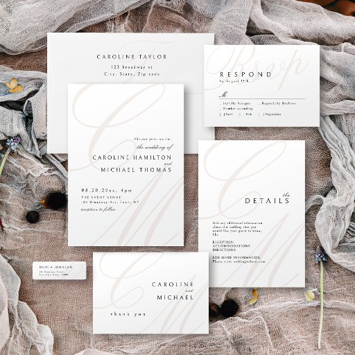 Modern classic elegant calligraphy couple monogram and timeless serif font event details in colour editable beige, black and white, simple and sophisticated, Great minimalist wedding thank you cards for formal vintage wedding, romantic traditional wedding, modern classic wedding and other events.