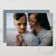 Announce your wedding in style with these elegant foil save the date cards. The design features your full-bleed horizontal photo with "Save the Date" in silver foil lettering. Personalize the modern photo save the date card with your names, wedding date, wedding location, and invitation details. The back of the card features additional details such as your wedding website in white lettering on a solid dusty blue background.