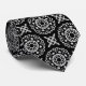 Classic elegant neck tie design featuring a seamless pattern made of white ornaments on black background.