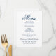 Formal navy blue wedding menu card design features beautiful typography that combines a traditional flourished calligraphy script with classic block lettering. Includes a decorative scroll design accent. The custom text can be personalized with a monogram of the bride and groom names and wedding date as well as the dinner menu details for the wedding day. Please shop our Classic Elegant Navy Blue Wedding Collection for coordinating designs.
