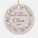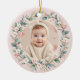 Celebrate a once-in-a-lifetime milestone with this Classic Floral Frame Baby’s First Christmas Ornament. Featuring your baby’s photo framed by a delicate watercolor wreath of muted greens, blush pink berries, and ivory blossoms, this keepsake is printed on smooth porcelain with a warm blush background. The back showcases “My Very First Christmas” with your child’s name and year, creating a timeless, heirloom-quality decoration to treasure for years to come. Perfect as a holiday gift for new parents or grandparents.