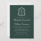This elegant vintage-inspired wedding invitation design features a pair of white monogram initials in open serif font above and below a dividing line and encircled by a line art acanthus crest on a dark forest green background. The back of the card is solid forest green.