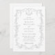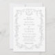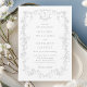 Elegant grey floral wedding invitation with a floral crest and monograms on the back.