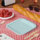 Modern summer trend picnic blanket gingham plaid tartan pattern in pastel blue and white colours.