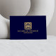 A faux metallic gold greek key emblem is combined with your name or business name for a chic logo on this designer business card template. Set on a dark navy blue background for a luxe aesthetic. Art and design © 1201AM CREATIVE / www.1201am.com