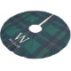 Personalized Christmas tree skirt featuring classic style dark green and navy tartan plaid with custom initial and family name monogram.