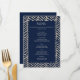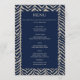 Un arrière - plan classique en sangliers de marine et taupe constituent la base de ce menu personnalisé traditionnel mais moderne et élégant de réception de mariage. Un insert bleu marine contient les informations pertinentes personnalisables sur le mariage.
