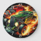 Two vintage hot rods speed forward, their engines roaring, as flames lick the sides, creating a thrilling contrast against the dark sky.