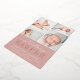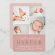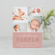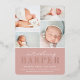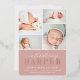 Elegant birth announcements feature four newborn photos arranged in a grid collage layout on a dusty rose blush pink background. "Introducing [name]" appears beneath in chic calligraphy script and rose gold foil block lettering. Personalize with baby's full name, birth stats, and a family signature at the bottom. A simple and clean gender neutral design for announcing your little one's arrival.