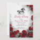 Celebrate the "Run for the Roses" with this timeless and elegant Kentucky Derby party invitation. Featuring a striking black horse silhouette galloping through a lush border of deep red roses and delicate greenery, this design combines classic equestrian charm with romantic floral beauty. The sophisticated script typography adds a touch of southern grace, making it perfect for a refined derby experience.