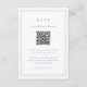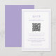 Classic style purple / lavender wedding RSVP Card featuring a simple and minimal design with an optional QR Code and details surrounded by a double border (if you prefer, you may remove the QR code in the design editing tool). The fonts alternate between and elegant script, a traditional serif and minimalist sans serif fonts. This response card is great for a formal wedding.