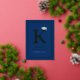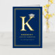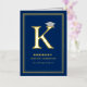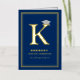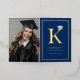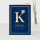 This classic and simple graduation announcement folded card in real foil pressed / foil stamped / foil stamping gold colour and dark navy blue graduation design features a bold monogram / initial 'K' of the graduate's first name with a mortar board / graduation cap.