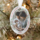 The ornament in oval shape has a classic silver frame adorned with Christmas plants and ribbon to display your own special memory of your new baby. The bright and shiny silver border encircles your photos. The holly, greenery and silk ribbon complete the whole design with a joyful atmosphere of the holiday season. Easily place your own memorable photo in place of the template photo as well as the name and year to make your own ones, and send it to your family and friends to celebrate the baby's first Christmas!