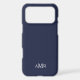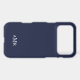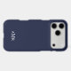 Classic design features personalized 3 letter initial monogram in white classic serif font style on navy blue background.