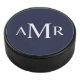Classic design features personalized 3 letter initial monogram in white classic serif font style on navy blue background.