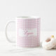 Bring a touch of timeless, rustic charm to your morning coffee or afternoon tea! This personalized mug features a vibrant pink and white gingham (checkered) pattern that evokes feelings of cozy farmhouse kitchens and sunny summer picnics.