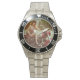 Has heft and feel of expensive stainless steel quartz watches. Good band with safety catch. I removed links, which is easy because engraved arrows show direction to push the linking pins. As always by this seller, the image (a railroad logo) is a perfect reproduction of my emailed image, and is precisely spaced and aligned.