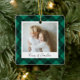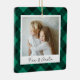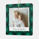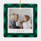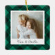 A sweet double sided photo ornament displaying a favourite photo on each side, on a black and green buffalo plaid background. Personalize with a custom caption on the front in handwritten lettering, and add the year to the back.