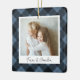 A sweet double sided photo ornament displaying a favourite photo on each side, on a black and blue buffalo plaid background. Personalize with a custom caption on the front in handwritten lettering, and add the year to the back.