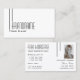 Make a lasting impression with this classic and simple business card design with fine decor black stripes and (employees-) photo on a plain white background.