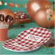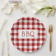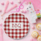 Get ready for your summer barbecue party with paper plates featuring dark red, white, and light red squares in a classic buffalo plaid with the letters BBQ in a white rectangle in the centre.