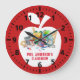 Classic Apple clock for classroom. Design features of white apple icon on red background and icons of school items inside an apple.