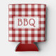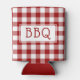 Keep your drinks cool in style at a barbecue with can coolers featuring dark red, white, and light red squares in a classic buffalo check plaid with the letters BBQ in a white rectangle on each side.