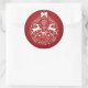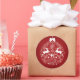 Classic round red and white Christmas sticker. Whimsical design of an ornament with a pair of deer, swirls and snowflakes against a rich red background.