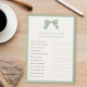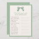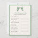 Editable game title and text questions for baby shower or bridal shower. Features a hand painted bow with subtle plaid in Sage Green and ivory background; editable border and background colour on front and back.