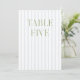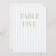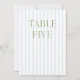 This elegant table number features a soft blue striped background with refined sage green serif typography and subtle script accents. Designed for garden weddings, refined receptions, and timeless outdoor celebrations.