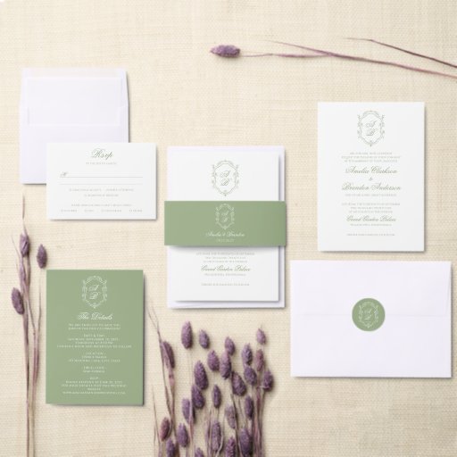 Classic Sage Green & White Monogram Crest Wedding Invitation