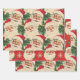 This vintage-style wrapping paper features a repeating pattern of classic Santa Claus faces. Each Santa sports a red hat and a full white beard, with rosy cheeks and a jolly expression. Interspersed among the Santas are sprigs of green pine, adding a touch of festive greenery to the design. The background has a textured, slightly aged appearance, giving it a nostalgic feel.