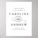 A Classic Script Black and White Wedding Welcome Sign featuring the couples names and elegant calligraphy script and with event date and location. Click the edit button to customize this design with your details.