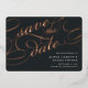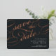 Elegant wedding save the date cards in rich charcoal black feature "save the date" in luxe rose gold foil script lettering for a bold and unforgettable look. Personalize with your wedding details in classic white lettering, and add additional information to the back.