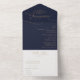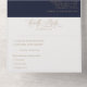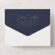 An elegant quinceañera invitation in blue navy and gold, featuring a traditional wording with an elegant calligraphy typography header. This all-in-one sustainable invitation would save you money, no need to include RSVP envelopes, your guests will tear away the last panel and mail it back to you as a postcard.