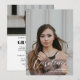 A classy modern graduation announcement and invitation card with a stylish script, text overlay, and two (2) photos (full portrait photo at the front and half card landscape photo at the back). Photos and details are easy to personalize and customize.