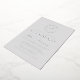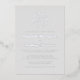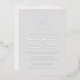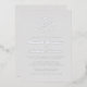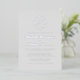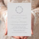 This elegant wedding invitation design features a script monogram initial encircled by a line art botanical wreath. The names appear in real silver foil script, with the rest of the text in classic serif font on a pale grey background. The back of the card is solid grey.