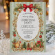 Celebrate the season in style with this elegant Christmas party invitation, featuring a vintage gold frame adorned with holly, pine sprigs, ornaments, and a festive red satin bow. The soft sage classic stripe background adds timeless charm and can be customized to any color to match your unique holiday palette or event theme.