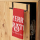 Classic typographic Christmas kitchen towel. Merry Christmas in classic decorative block text with name field in plain text. Red with white text.