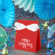 Classic typographic Christmas party favour box. Merry Christmas in classic decorative block text with name field in plain text on front bottom and back. Red with white text.