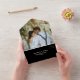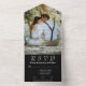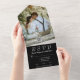 Introducing our classic all-in-one invitation which allows you to features a treasured picture of your choice as the background. This invitation is a simple black background with white text and is perfect for couples seeking a sleek, minimalist and classic aesthetic for their special day. The highlight of this invitation is the convenient QR code, allowing guests to RSVP effortlessly using their smartphones. For traditionalists, we've included a traditional paper RSVP option as well. With the all-in-one design, guests can easily tear away the RSVP section and send it back. Additionally, we've provided email information for RSVPs, ensuring a seamless and convenient RSVP process. Fully customizable, this invitation also offers the option to add a cherished photo, adding a personal touch to your wedding announcement. This template was created using a photo with a landscape orientation, and the customer, in all likelihood, will have an easier time with successful picture placement using a photo with a landscape orientation.