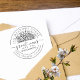 This beautiful round return address stamp features ´´great news´´ text in classy handwriting in the middle, flanked on the top by a bunch of rustic wildflowers. On the bottom, there is a family name in classic serif typography. The address, written in lighter font, gracefully bends around it, in a circular manner. This romantic stamp certainly will add elegance to your special correspondence! To customize this design, simply click on ''Personalize this template'' and change all details. Don't forget to choose the ink colour to personalize it even more!