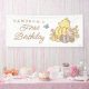 Create a magical party backdrop with this personalized Winnie-the-Pooh first birthday banner. Featuring a timeless illustration of Pooh and Piglet, this banner sets a whimsical and nostalgic tone for your celebration. Display it at the party entrance, behind the cake table, or as a focal point for photos to beautifully capture the moment. This banner is the perfect way to welcome guests and celebrate your little one's special milestone in classic storybook style.