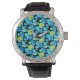 A very stylish Wristwatch, with a 'Blue Moons' abstract pattern in bright blues and neon green on a black background; from a handpainted paper collage design by Judy Adamson