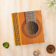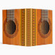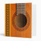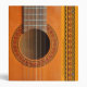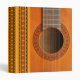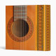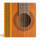 A close-up of an orange-tan coloured classical guitar showing the strings and frets, and rosette pattern in red and green repeated on the spine and sides, ideal for sheet music, or notes/business papers for tutors or performers.