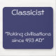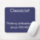 A blue mousemat with white text reading "Classicist- Poking civilizations since 493 AD". Classicists study aspects of both ancient Greece and the Roman empire, including the language and archeology.