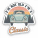 A retro-style illustration featuring a classic turquoise Beetle car in front of a vibrant sunset, surrounded by pine trees. The text humorously reads “I’m not late, I’m on vintage time,” highlighting a nostalgic and playful vibe.